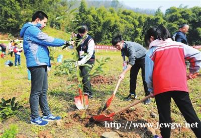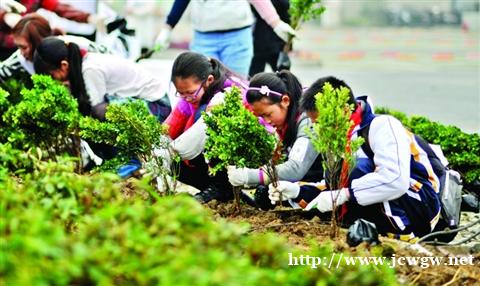 同学们快速开始植树,挽起袖子,挥锹铲土,心里想的容易,动起手来才发觉并不简单。不一会儿,大家都是汗如雨下,气喘吁吁。十分钟过去了,树坑才碗口大小,大家不禁产生了一丝挫败感。终于,在我们不懈努力之下,一个个树坑出现在眼前,心理难免有些小激动,毕竟是通过自己辛勤劳作得来的。大家兴奋地拿起树苗投入坑中,一人扶正,一人小心翼翼往坑里填土,将土壤填满结实后,在土壤上浇水。一颗颗小树苗种好了,四处都洋溢着欢乐的气氛。看着刨出来的土又一点点被填回去,但坑中多了一株嫩绿的生命,放眼望去,大家锄的锄,铲的铲,干得热火朝天,大家的内心一定是心潮澎湃的。